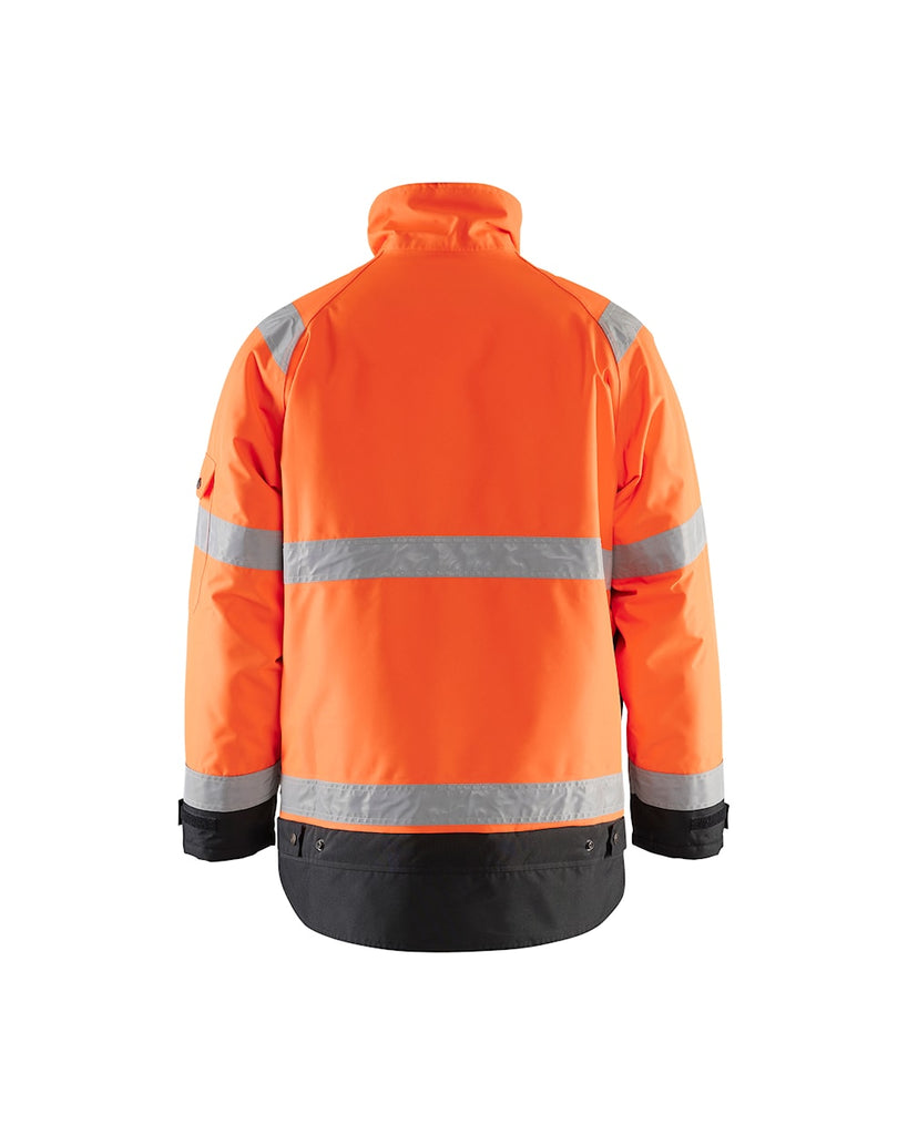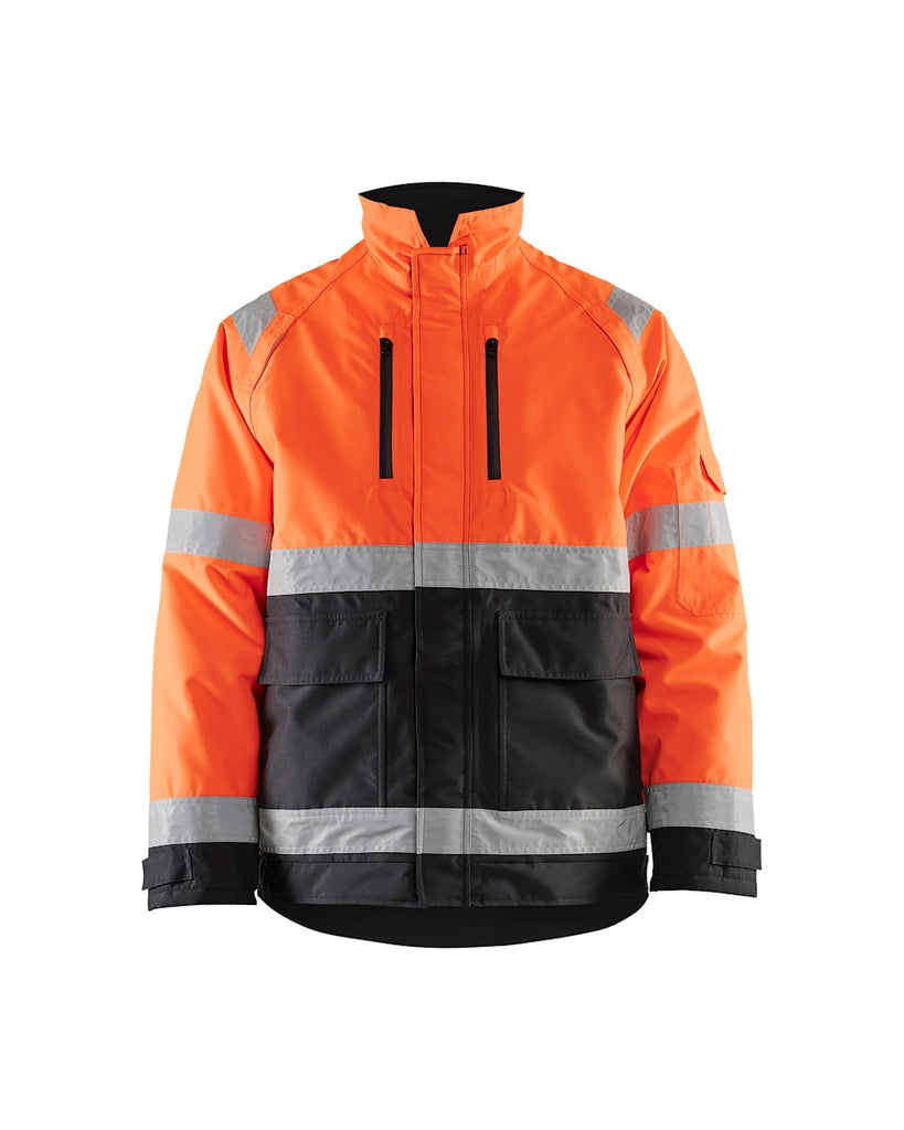 Wind and waterproof with a heavy quilt lining to keep you warm and dry. Fleece lined collar. The winter jacket includes waterproof taped seams, storm cuffs, waterproof chest pockets, arm pocket and 3M reflective tape. ANSI 107 Class 3.