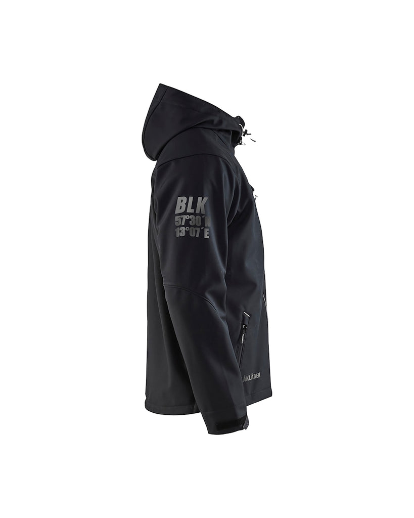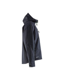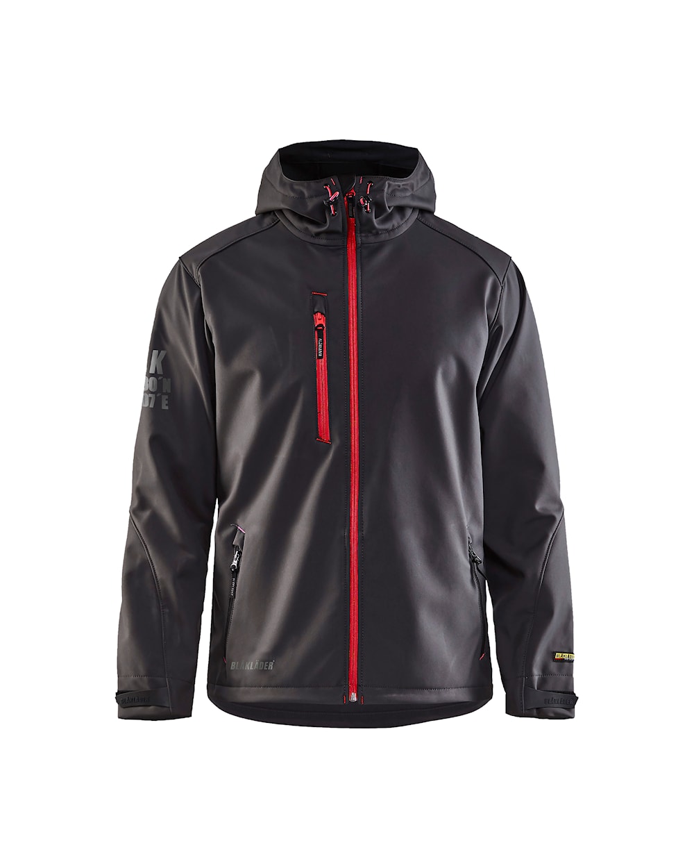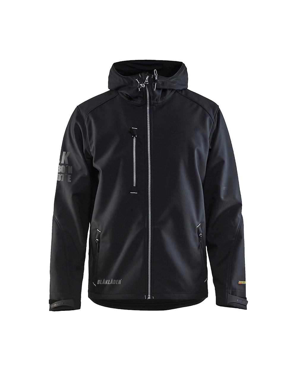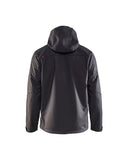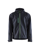 100% polyester, 3-layer softshell fabric, wind- and waterproof, breathable, 9 oz